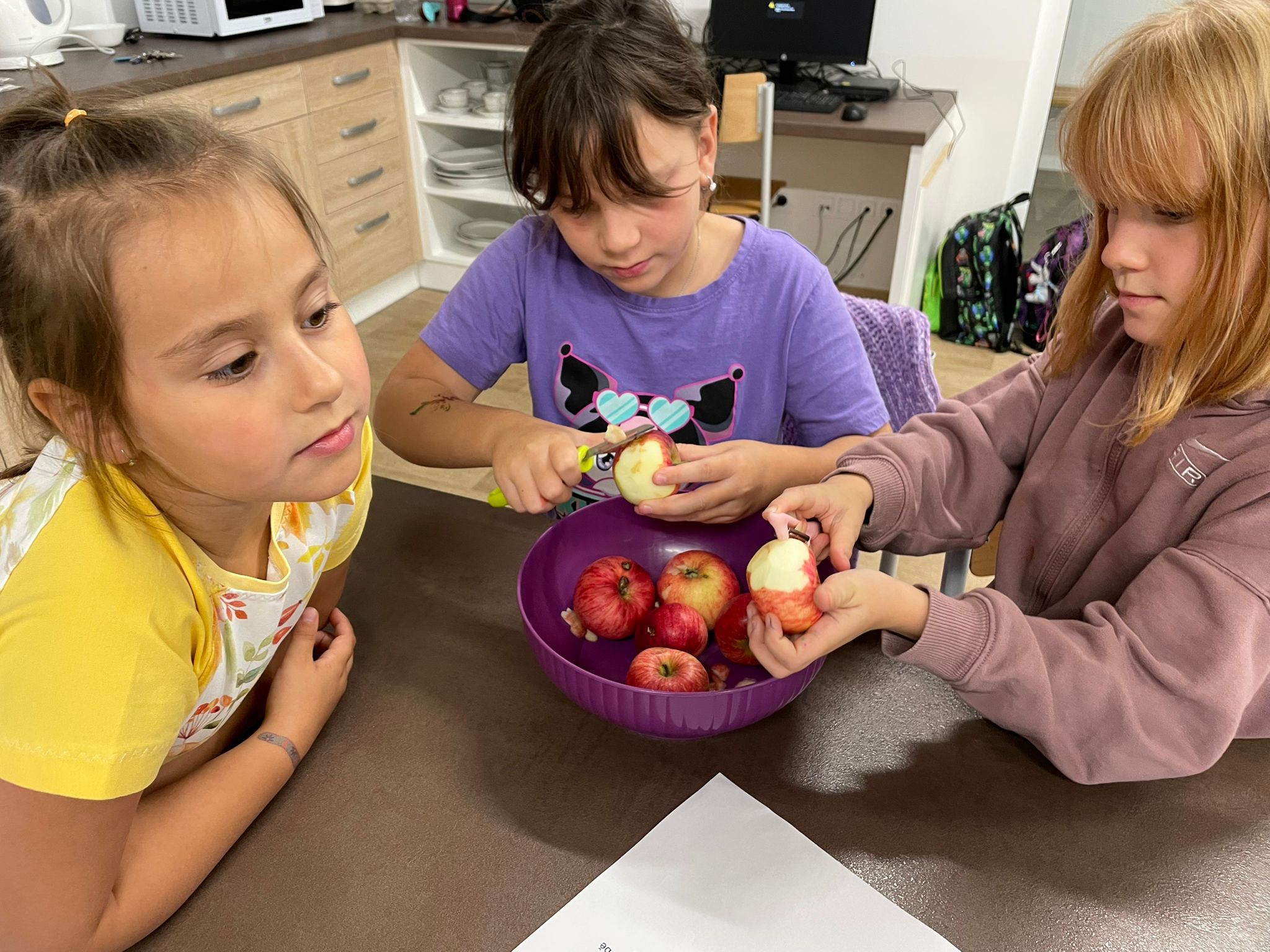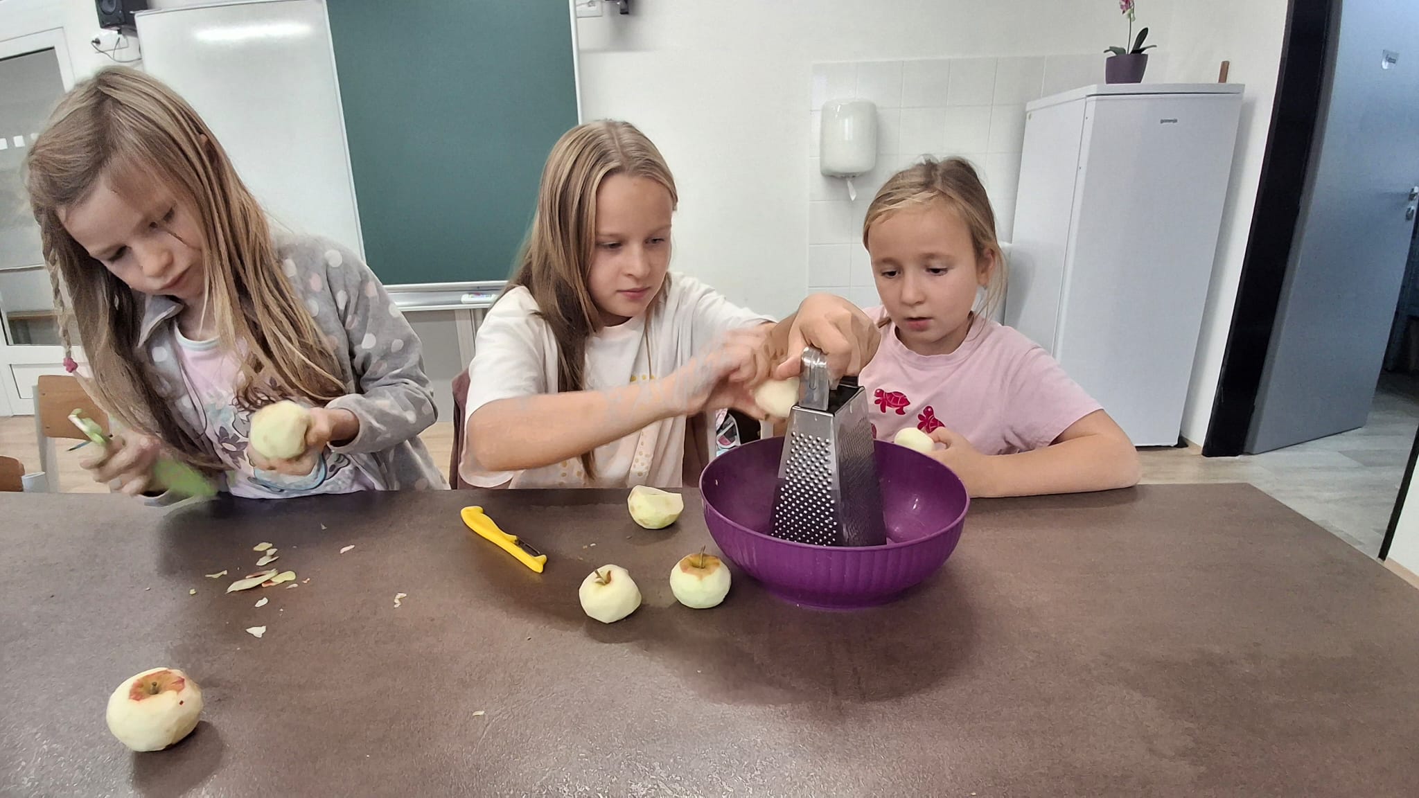 Ve školní družině jsme si užili voňavé odpoledne plné společné práce a radosti z vlastnoručně připravené dobroty. Nejprve si děti z oddělení č. 5 a 8 nasbíraly jablka na školní zahradě, která poté oloupaly a nastrouhaly. Rozdělené do čtyř týmů, vedených staršími spolužáky, se pustily do přípravy štrúdlů – vyválely listové těsto, přidaly voňavou jablečnou náplň a vše připravily k pečení. Odměnou za společné úsilí jim byl nejen sladký štrúdl, ale i radost ze spolupráce a příjemně stráveného času. Společné pečení nás bavilo a rozhodně nebylo naposledy – už se těšíme na další dobroty.