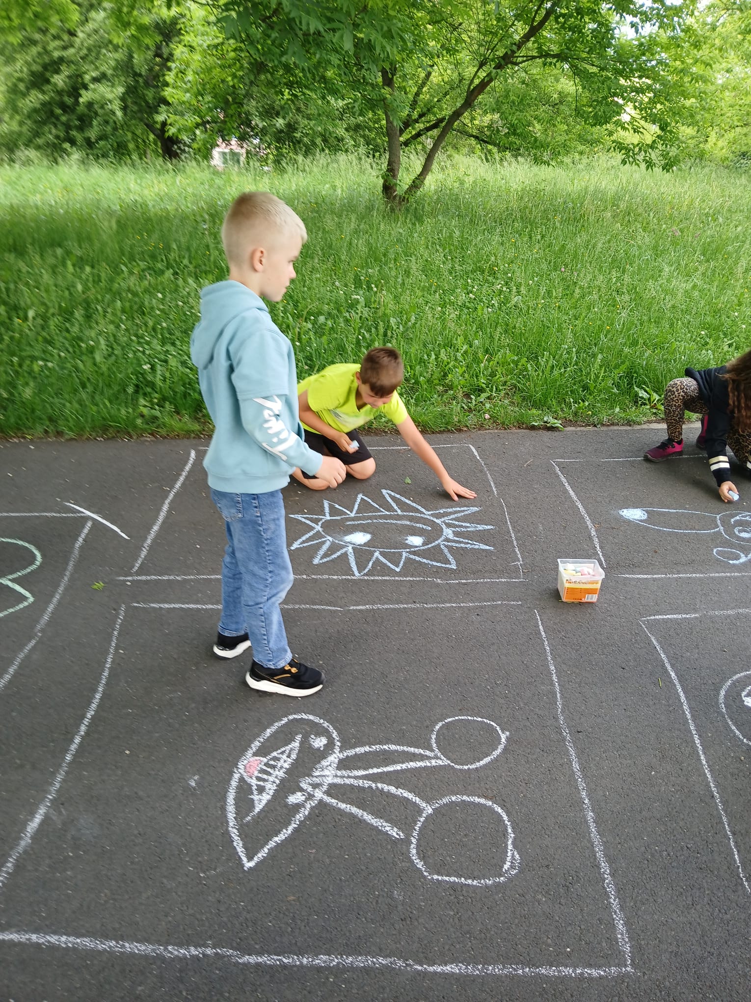 Koloběžkovým závodům předcházelo výtvarné odpoledne – malování na chodníku na téma Modrý Poťouch a ti druzí. 2. oddělení se vydalo na kopec , aby tam ztvárnilo postavy z knížky čtené ve školní družině.