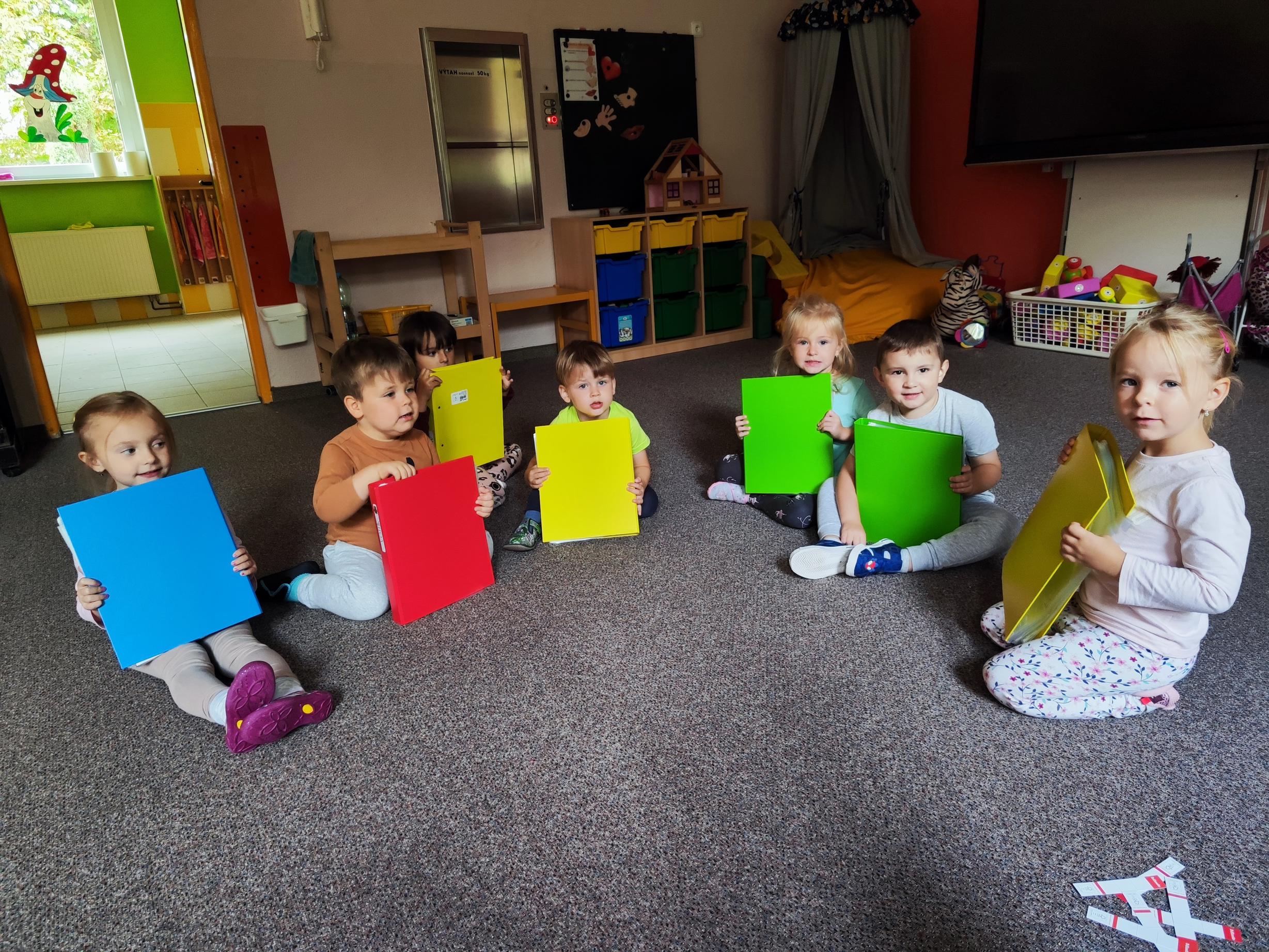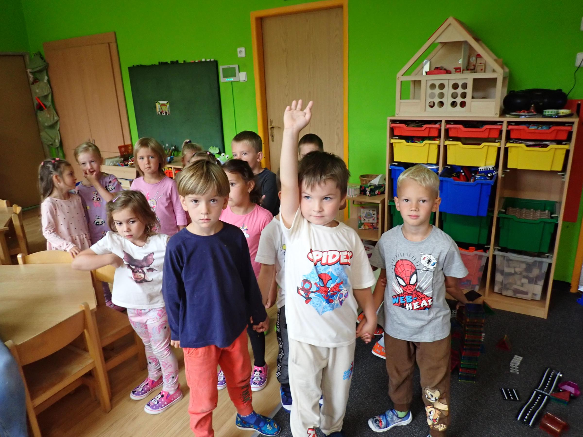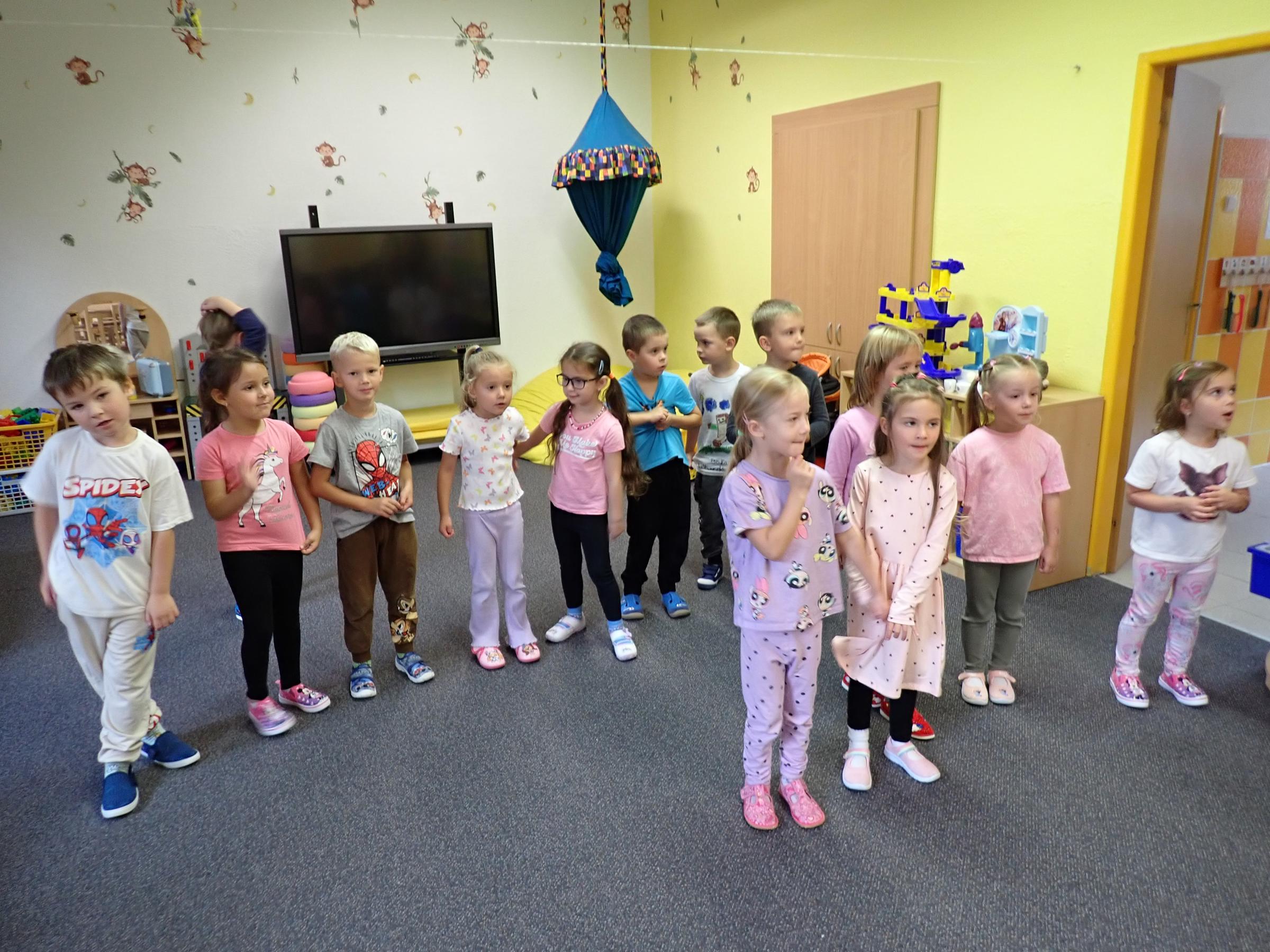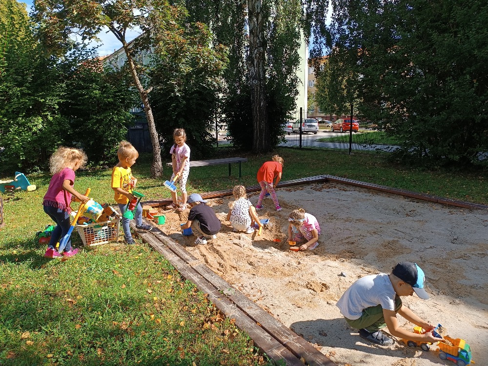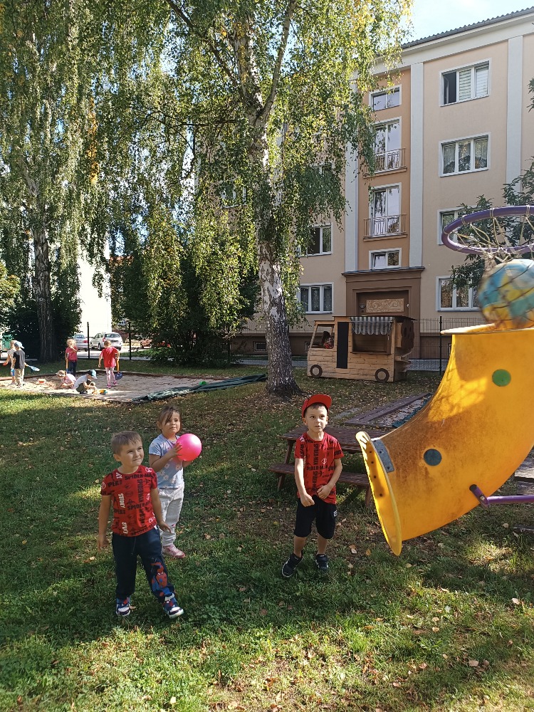 Děti se seznamovaly s novými učiteli, asistentkami a novými kamarády. Pro nejmenší Myšky se jednalo o adaptaci na školku. Během prvního adaptačního týdne si postupně zvykaly na nové prostředí i nové děti z ostatních tříd. Jednotlivé třídy chodily na průzkum po celé školce, navštívily paní kuchařky a paní uklízečky. Děti předvedly, co se již stačily naučit a byly odměněny potleskem. Také jsme chodili do okolí školky a hledali známá i neznámá místa. Nejmenší děti se učily chodit ve dvojicích s dráčkem. Na školní zahradě si děti hezky pohrály. Všude se učily zvládat naše bezpečnostní pravidla. Nový školní rok nám začal a všichni se těšíme na nové zážitky strávené ve školce i mimo ni.